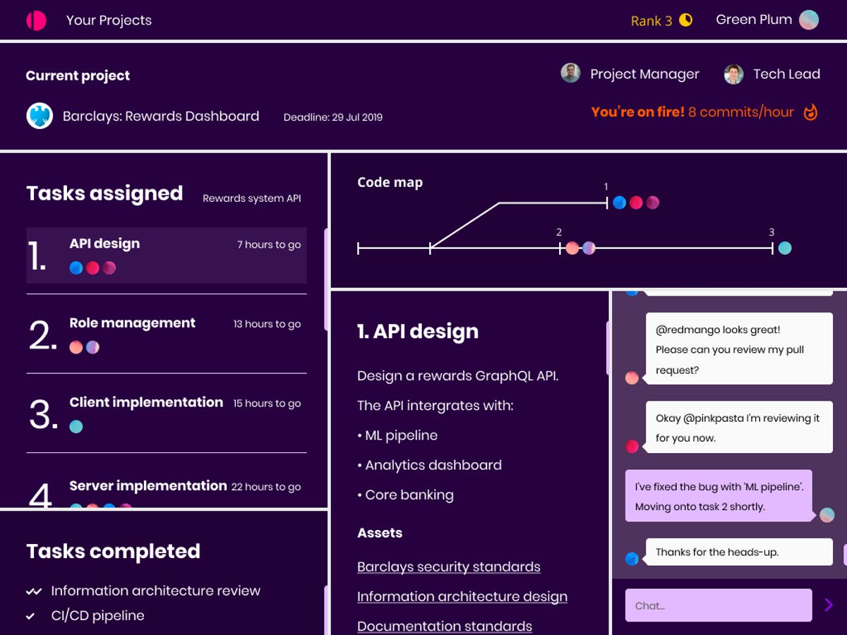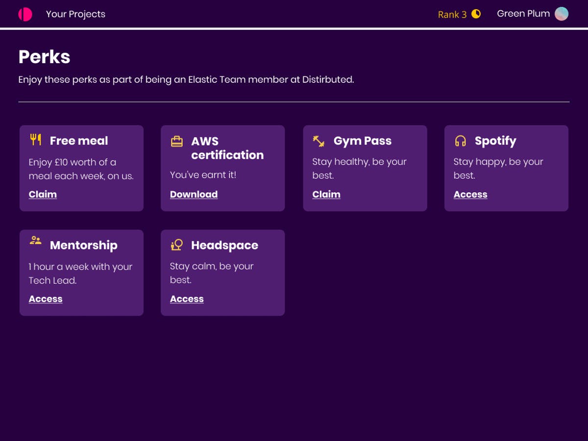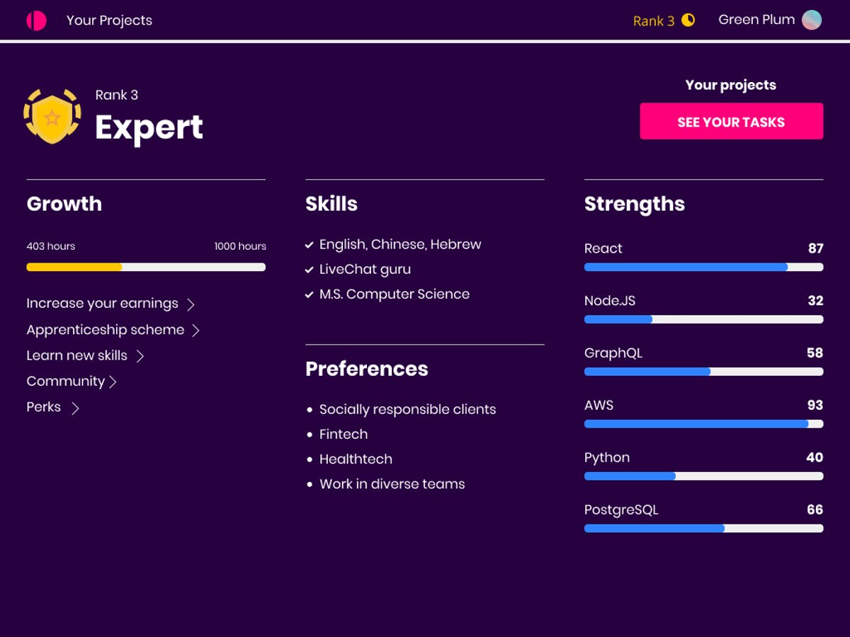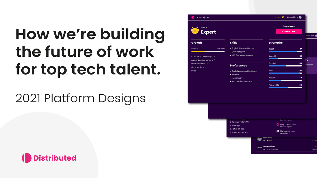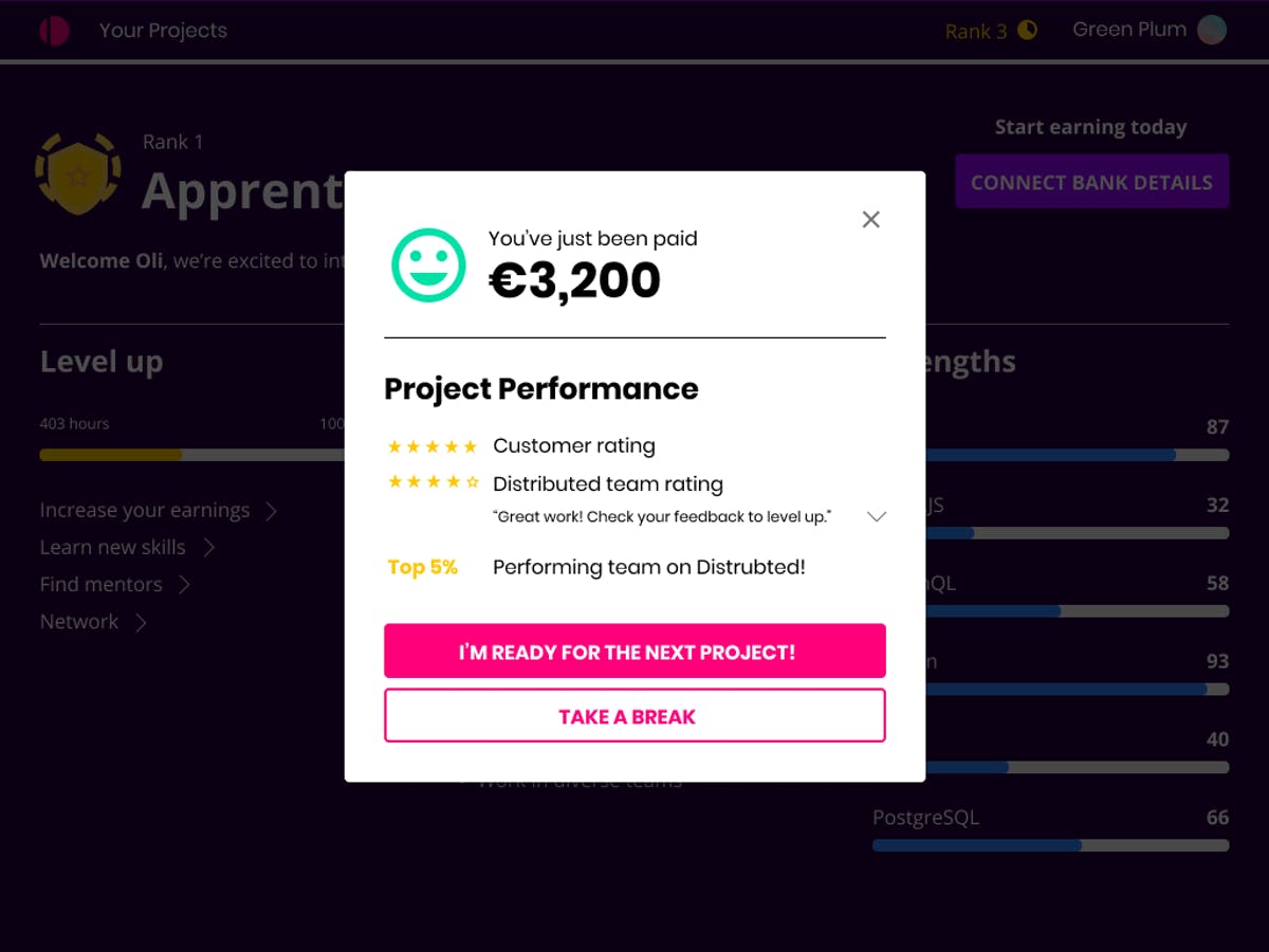 You’ve already achieved ‘Rank 3’ with your time at Distributed, you’re almost halfway to ‘Rank 4’ [left side]. This is primarily calculated based on time worked, quality of code, peer and customer feedback. As you might expect, the higher rank you earn, the more earning and teaching potential you have.