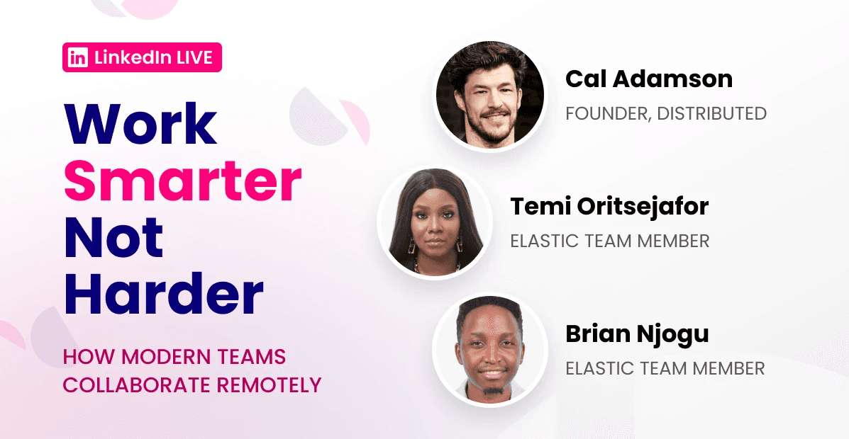 We recently hosted a LinkedIn Live with Distributed Founder Cal Adamson interviewing two Elastic Team members: Temi Oritsejafor and Brian Njogu. During the chat, they talked about their experiences as remote freelancers collaborating with teams across time zones and geographies. They brought insights to the conversation that will hopefully help other remote teams work with more ease, productivity, and empathy. If you missed it, don’t worry. Check out our main takeaways and watch the full recording on our LinkedIn page.
