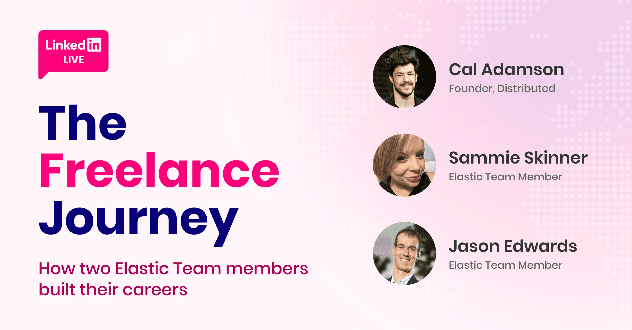 Did you miss our last LinkedIn Live with Elastic Team members Sammie Skinner and Jason Edwards? Distributed Founder Cal Adamson spoke with them about their freelance journeys and how they intentionally build successful, independent careers. If you missed it, don’t worry. Check out our top three takeaways and watch the full recording on our LinkedIn page.